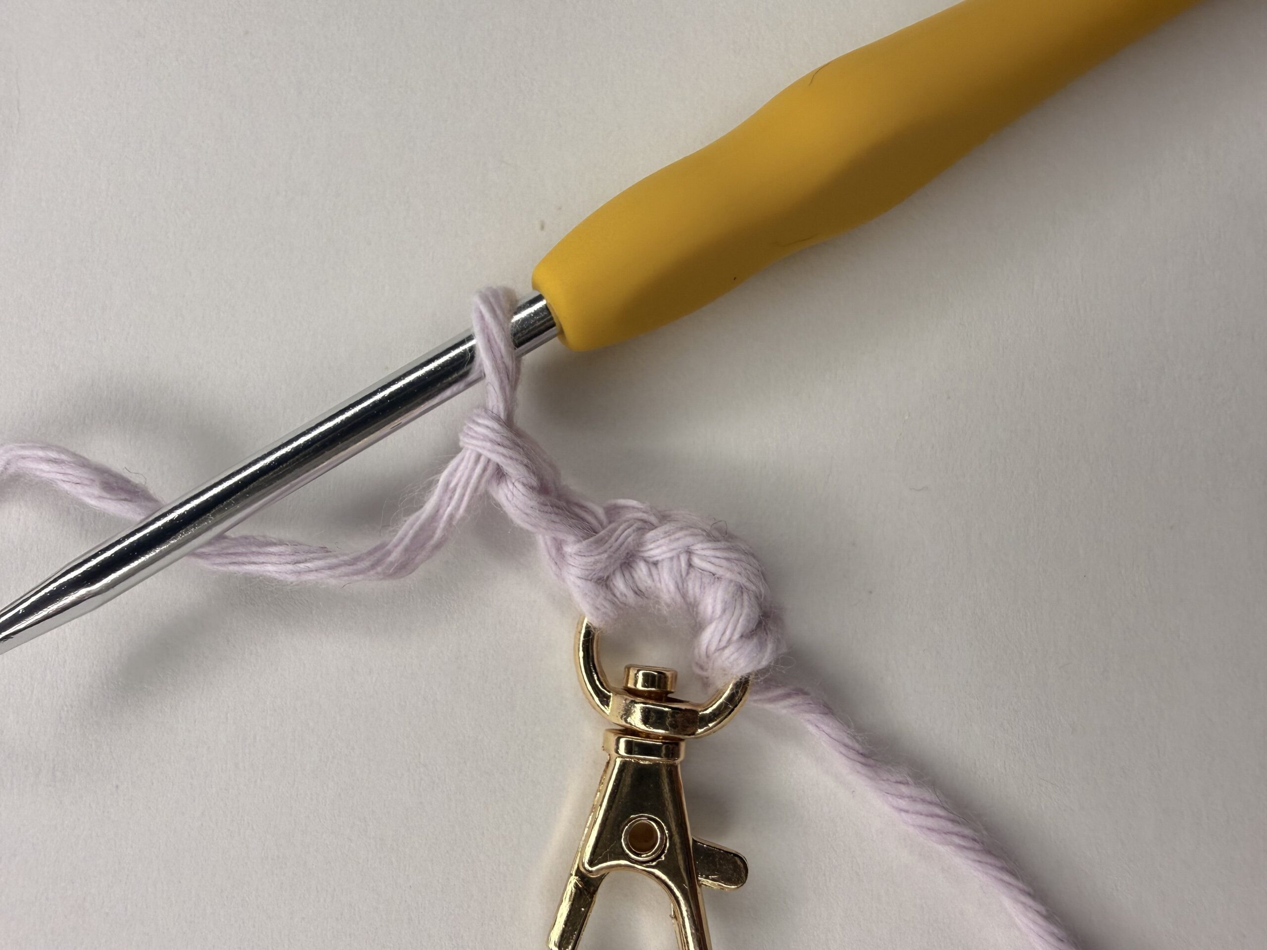 Start by making a loose slip knot. Place your crochet hook under the ring. Yarn over and make a slip stitch on the lobster clasp ring.