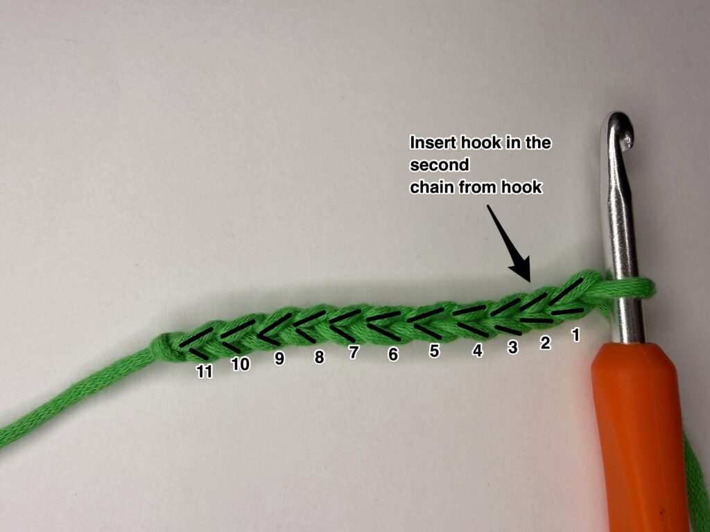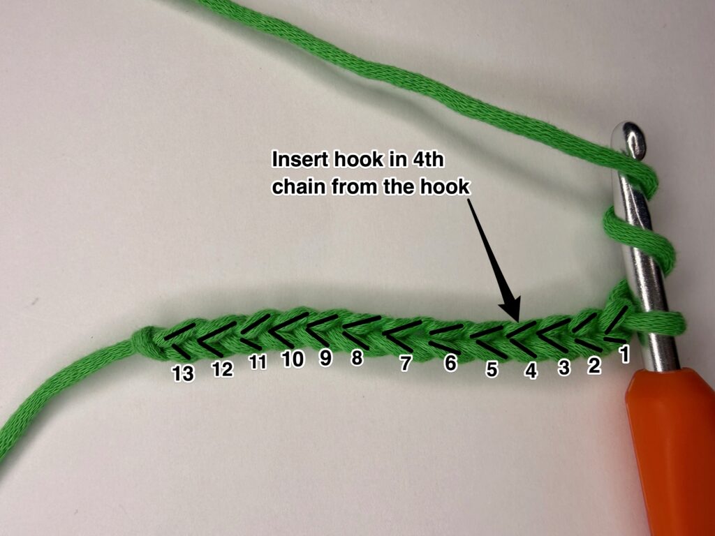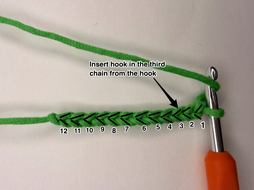 Step 1: First, you’ll yarn over. Then you’ll insert your hook in the 3rd chain from the hook.